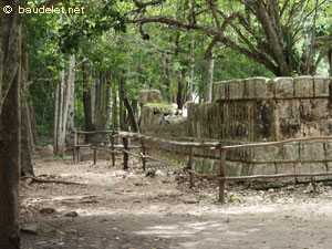 Il s'agit d'un bâtiment avec des façades chargées de décorations de pierre, cresterias, et partout, au-dessus des portes, sur les frises, à l'angle des murs, des masques de Chac, le dieu de la pluie maya. Sur linteau sculpté, on reconnaît un prêtre assis sur son trône, face à un récipient et entouré de glyphes. Il s'agit d'un bas-relief typique de l'époque classique. |