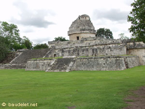 A quelques centaines de mètres au sud du coeur de Chichen Itza, ce bâtiment domine une série de monuments toltèques. C'est une construction circulaire, la seule de ce genre en terre maya. Le Caracol (escargot) doit son nom à un escalier intérieur qui monte en spirale. Cet édifice en forme de tour (12,50 mètres de haut) était un observatoire. Il repose sur deux terrasses superposées. L'escalier en colimaçon mène à une petite chambre d'observation en haut du bâtiment. |